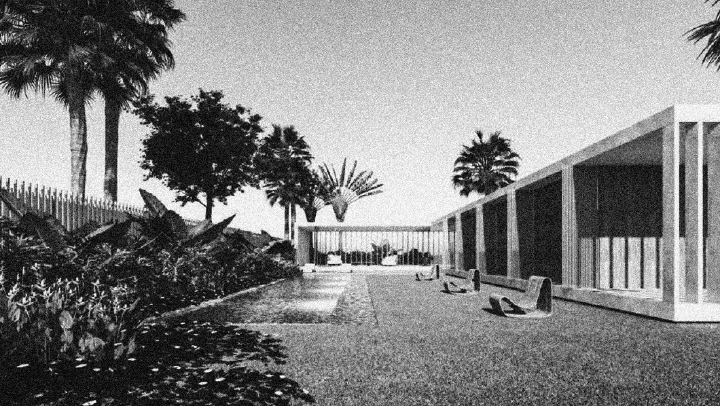 Single-story house defined by a horizontal exposed concrete architecture. The residence opens onto the garden through large glazed surfaces and a longitudinal pool, while concrete solar-control elements regulate light and provide privacy from the street.